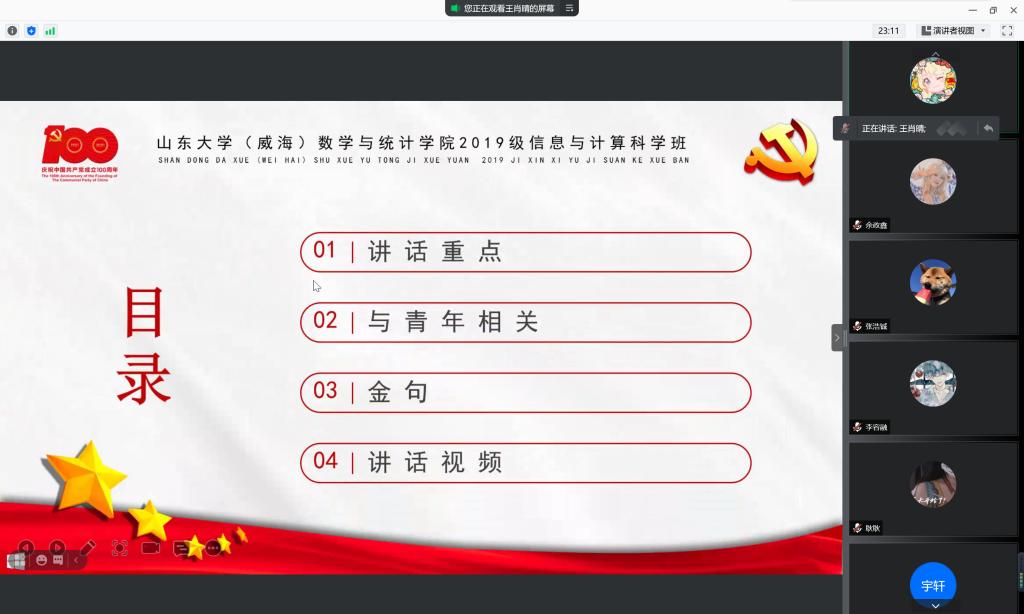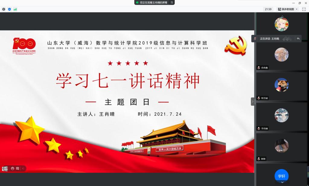 本站讯 2021年7月24日下午15:30,KY开元集团官网2019级信息与计算科学班于腾讯会议举办“学习七一讲话精神”主题团日活动。本次活动由信息与计算科学班团支书王肖晴主持,共41人参加。