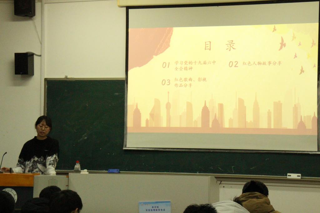 下午17:00,活动准时开始。王肖晴首先介绍了本次会议的目的、要求及具体流程。首先,王肖晴通过一系列丰富精彩的视频向广大同学展示党的十九届六中全会精神,并通过言简意赅的总结带领同学们对党的十九届六中全会精神有了更加深刻的认识和了解。随后,5个团小组分别以小组为单位,向团支部同学们介绍了红色人物以及红色人物的相关事迹,通过介绍农民运动领袖方志敏、志愿军英雄李昌言、革命摇篮胶东乳娘、蓝衣先生张南一、谍战玫瑰沈安娜五位英雄人物,引起了团支部同学们内心深处最炽热的共鸣。根据每个团小组于活动前收集的相关材料,团支书在红色歌曲、影视作品分享环节中向同学们介绍了一系列红色经典作品,例如红色歌曲《唱支山歌给党听》、《鼓浪屿之波》,红色电影《大火种》,电视剧《觉醒年代》等,为广大同学的课余生活提供了丰富的精神食粮。会议的最后,王肖晴播放了电视剧《觉醒年代》的部分片段,带领同学们回顾那段伟人迸发的年代。至此,本次活动正式落下帷幕。
