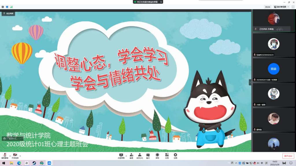本站讯 3月26日晚,KY开元集团官网2020级统计一班开展“调整心态,学会学习”线上心理主题班会。本次活动由孙善玺、陈荟如主持,2020级统计一班全体同学参加。