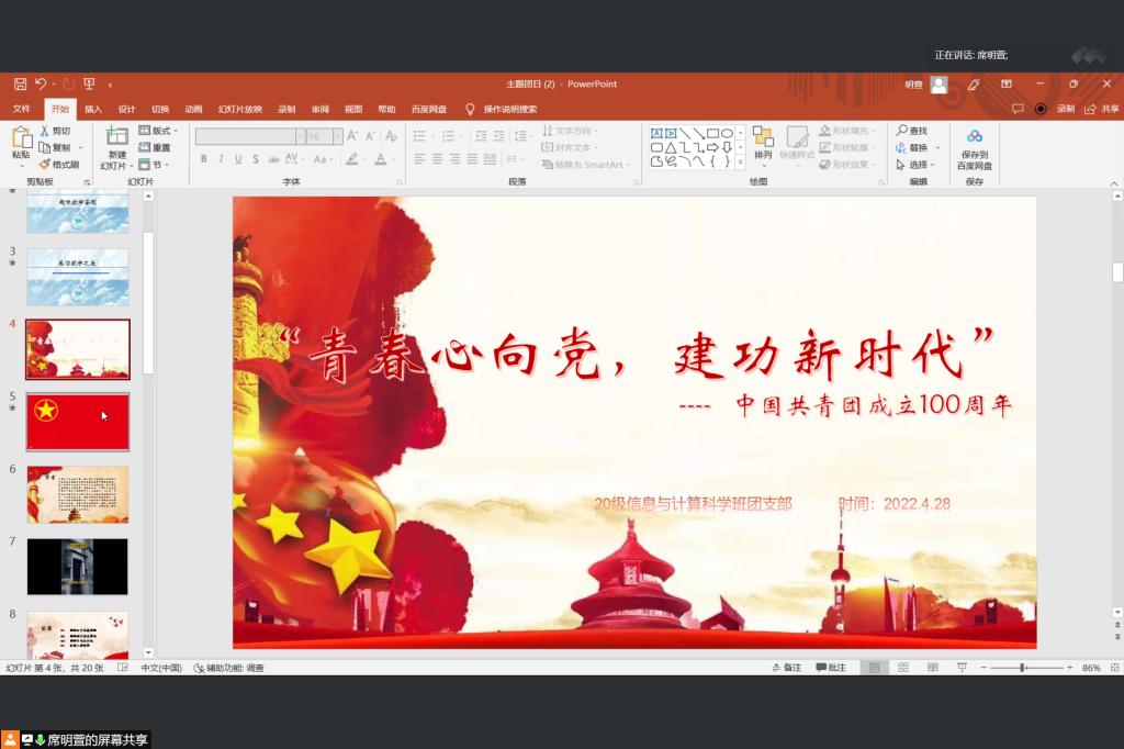 本站讯 4月28日晚,KY开元集团官网2020级信息与计算科学班开展“青春心向党,建功新征程”主题团日活动。活动由团支书席明萱主讲,2020级信息与计算科学班全班同学共同参与。